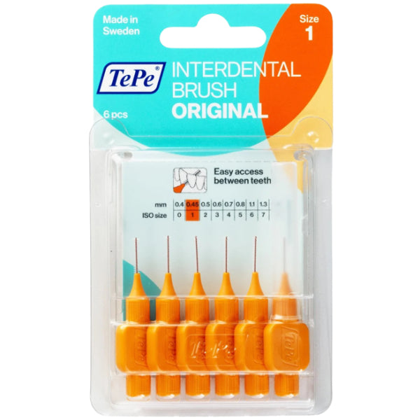 2 x TePe Interdental Brushes 0.45mm Orange Size 1 Original - ISO an interdental brush by TePe, designed to clean the gaps between the teeth, where a regular toothbrush is unable to reach. Use daily to keep gums and teeth healthy and fresh.