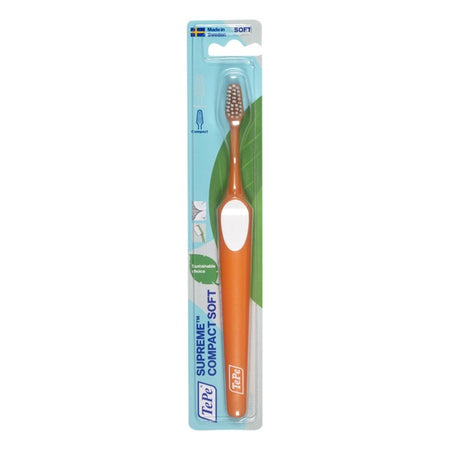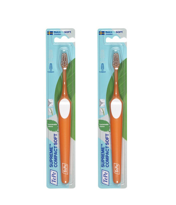 2 x TePe Supreme Compact Toothbrush is an innovative toothbrush with filaments in two levels. This design enables more efficient cleaning further in between the teeth and along the gum line.