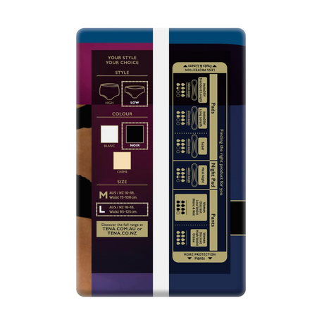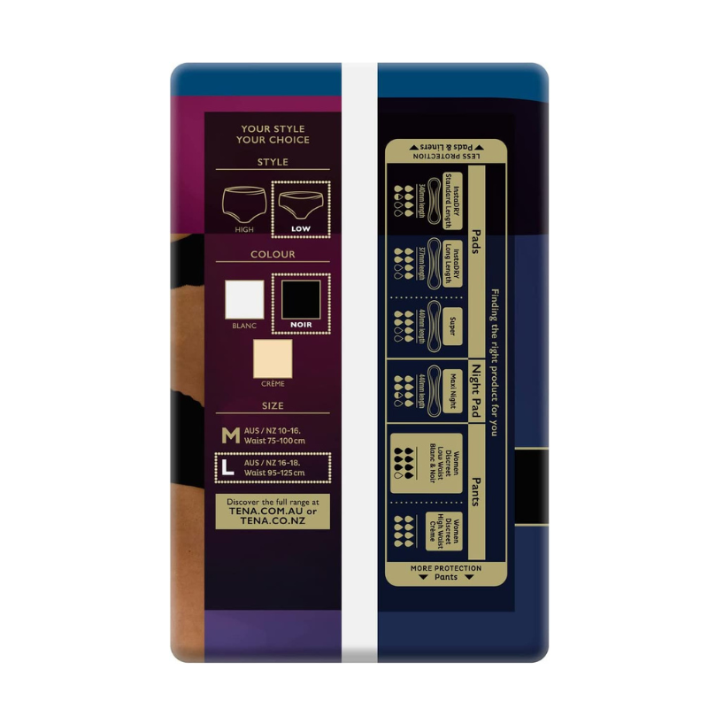 TENA Discreet Low Waist Noir is all-black, inside and out, featuring a low, wavy, lingerie waist to suit your style. Get the protection you need from moderate leaks without compromising on style with this elegant, feminine bladder weakness underwear.
