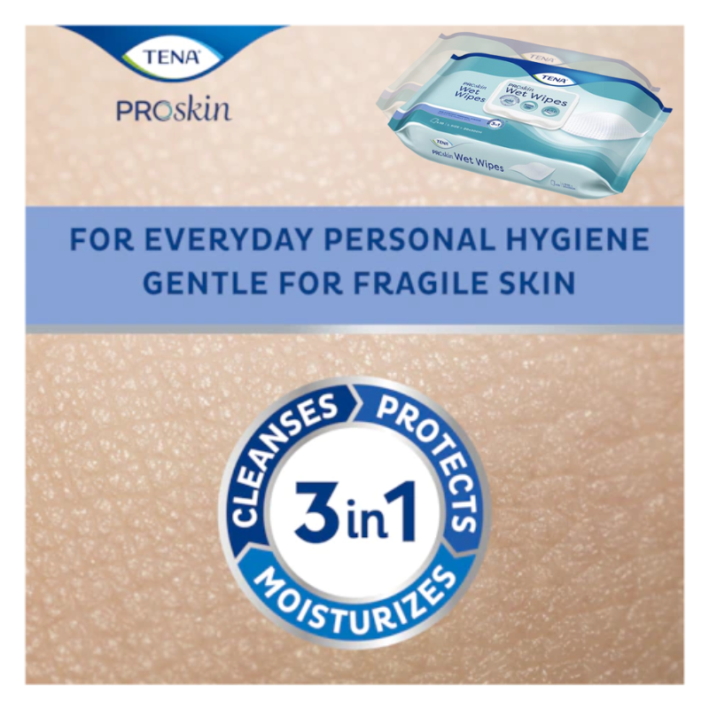 TENA Wet Wipes, are pre-moistened, adult-sized wet wipes that cleanse, protect and moisturise even the most fragile skin. For everyday use, these large wet wipes are ideal for cleansing intimate areas when changing incontinence products or for full-body cleansing. Being a gentle alternative to soap and water, TENA ProSkin Wet Wipes helps to keep the skin feeling fresh, clean and free of odour. Plus, the handy plastic lid enables one-handed dispensing.