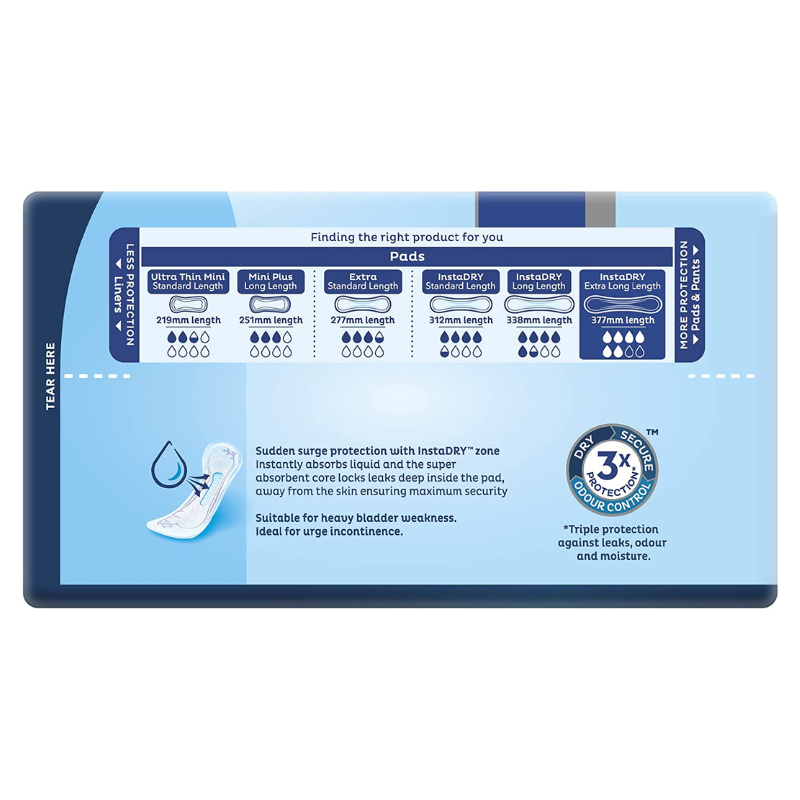 - InstaDRY™ technology quickly absorbs liquid deep into the pad and protects against bladder leakage
