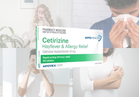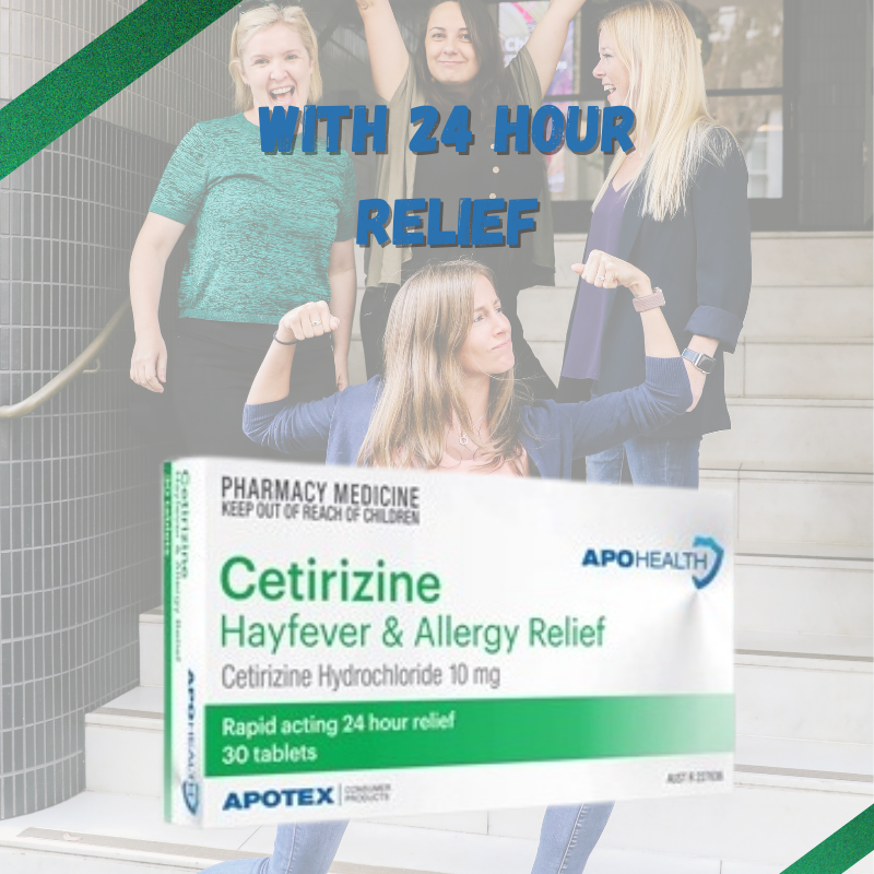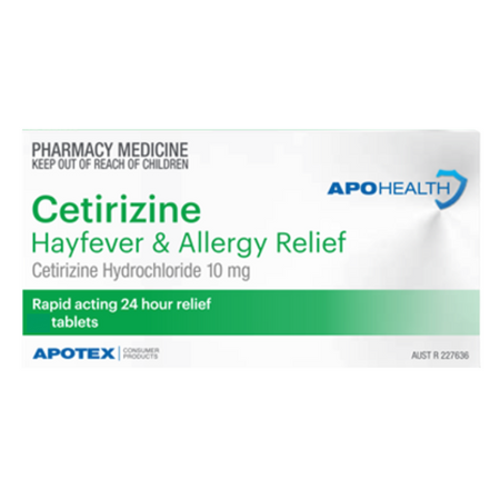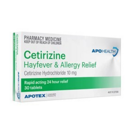 APOHEALTH Cetirizine, is indicated for the relief of symptoms associated with seasonal allergic rhinitis (hay fever) in adults and children 6 years and over. Symptoms treated effectively include sneezing, rhinorrhea, post-nasal discharge, nasal pruritus, ocular pruritus, tearing and redness of the eyes., Perennial allergic rhinitis: Cetirizine is indicated for the relief of symptoms associated with perennial allergic rhinitis in adults and children 6 years and over.