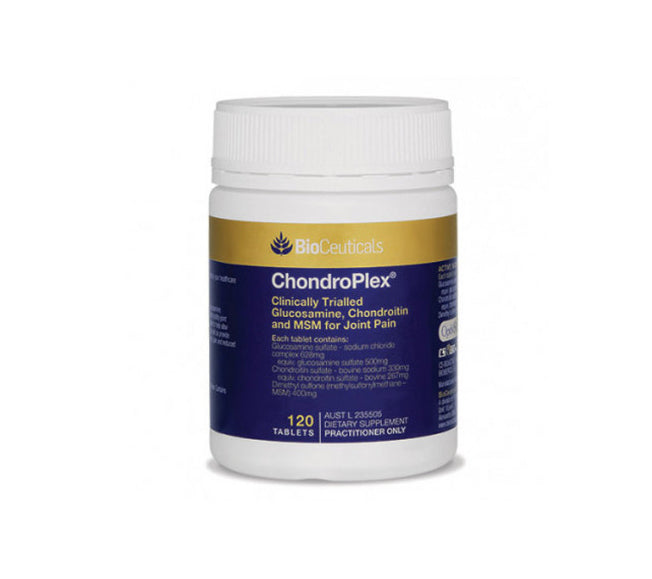 BioCeuticals ChondroPlex combines glucosamine and chondroitin with dimethyl sulfone (MSM) to provide a comprehensive joint formula. ChondroPlex provides clinically trialled doses of glucosamine and chondroitin to help relieve symptoms of mild osteoarthritis of the knee including mild joint swelling, pain, reduced mobility, cartilage wear and narrowing joint space.