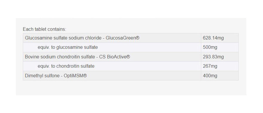 - Provides 1500mg of glucosamine, 800mg of chondroitin and 1200mg MSM per daily dose.