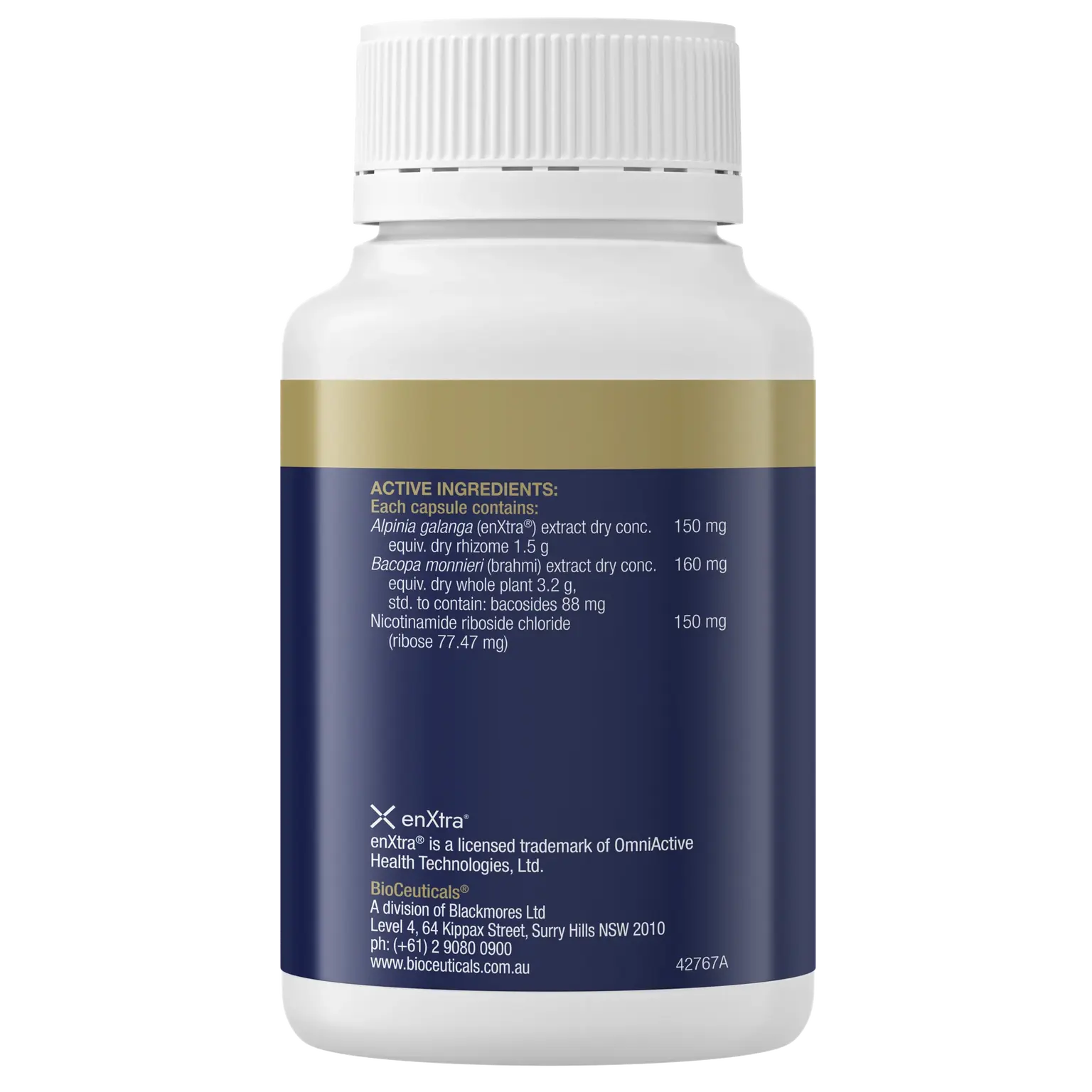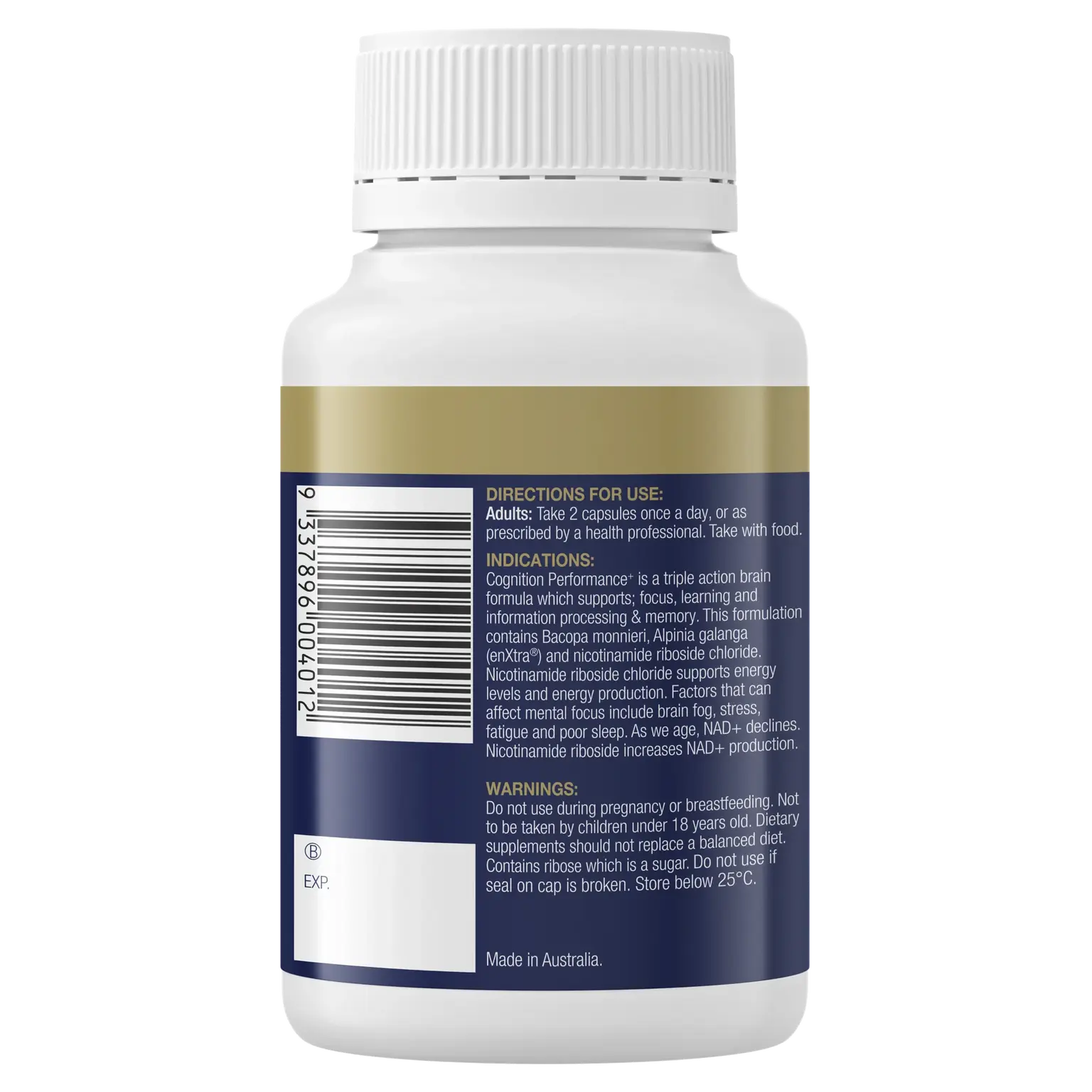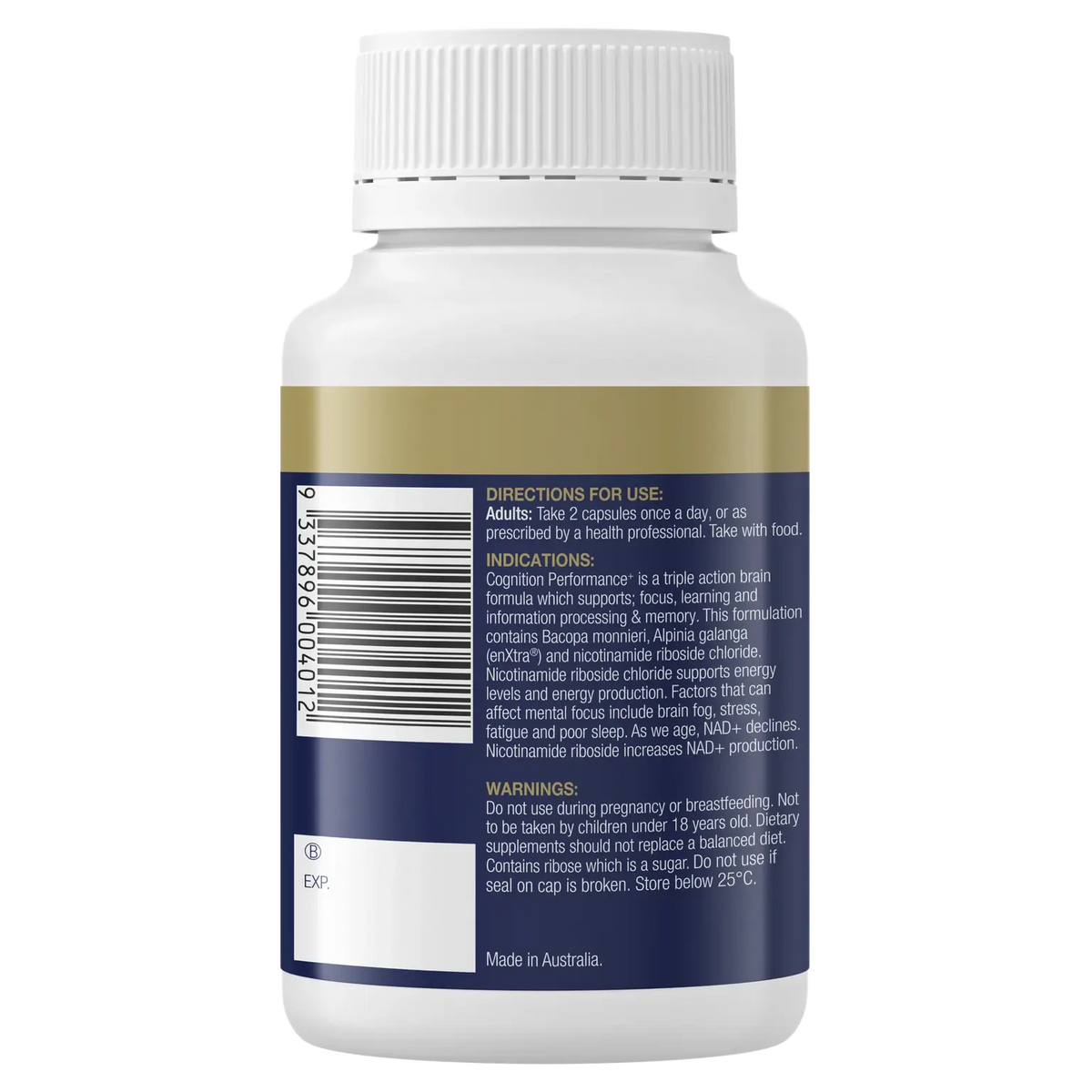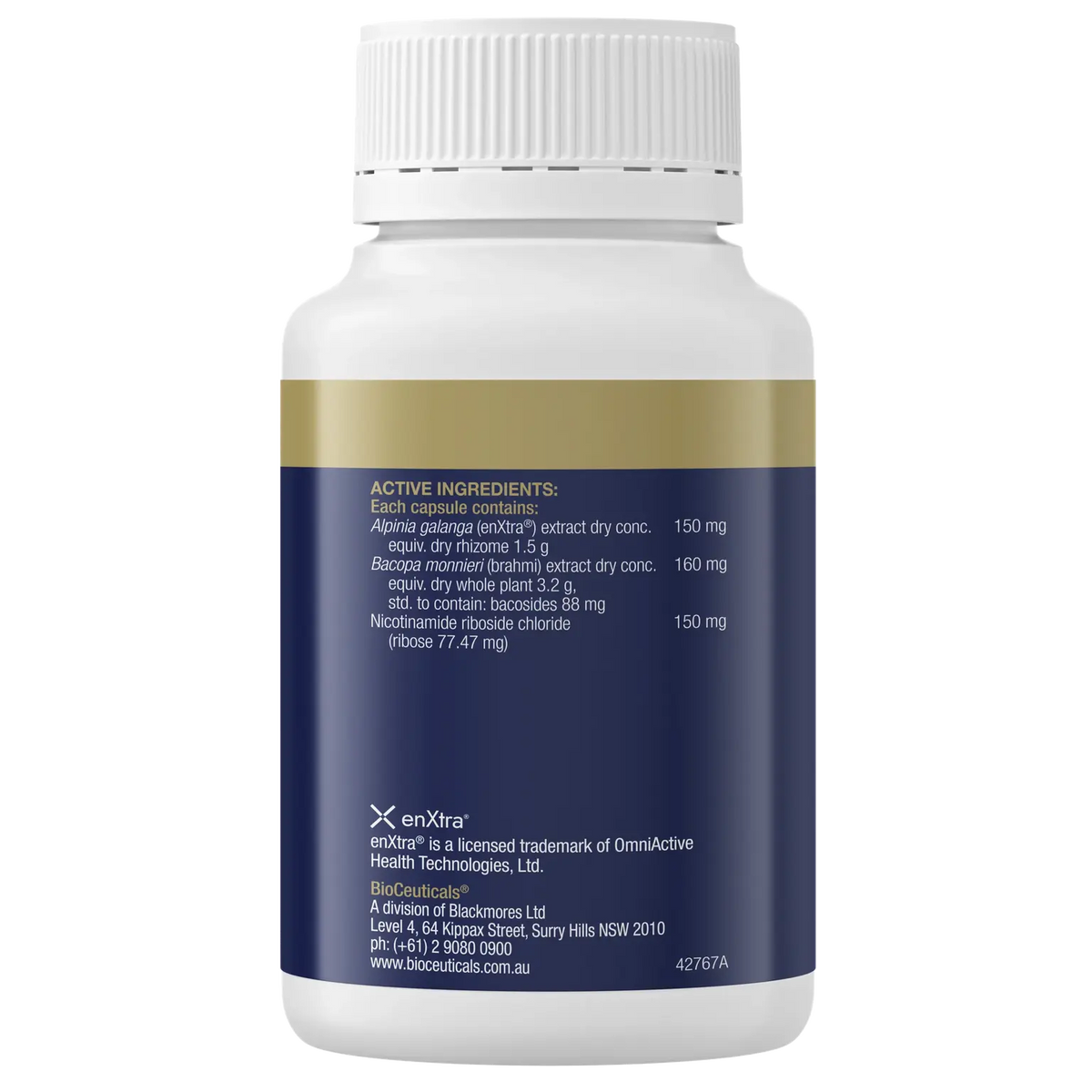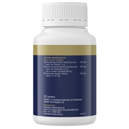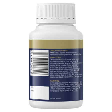 Cognition Performance+ is a triple action brain formula which supports; focus, learning and information processing & memory. This formulation contains bacopa monnieri, alpinia galanga (enXtra®) and nicotinamide riboside chloride. Nicotinamide riboside chloride supports energy levels and energy production. Factors that can affect mental focus include brain fog, stress, fatigue and poor sleep. As we age, NAD+ declines. Nicotinamide riboside increases NAD+ production.
