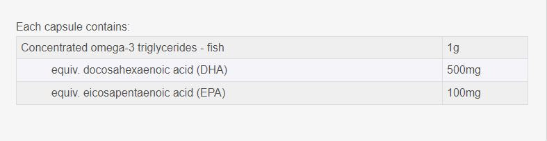 Ingredients: Each capsule contains: Concentrated omega-3 triglycerides-fish 1g, equiv. docosahexaenoic acid (DHA) 500mg, equiv. eicosapentaenoic acid (EPA) 100mg