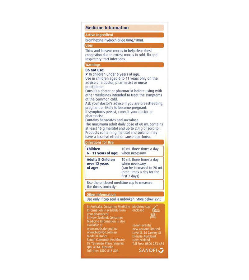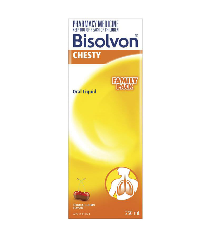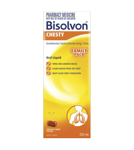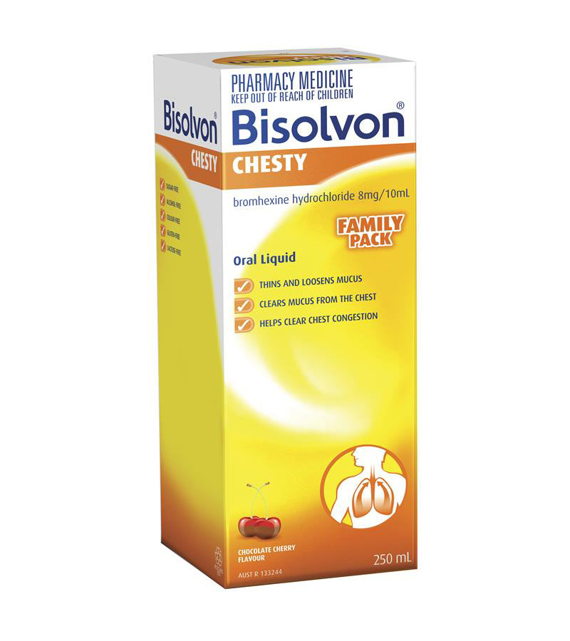 Bisolvon Chesty Liquid contains bromhexine hydrochloride (4mg per 5mL), is available in a 250mL bottle, and comes in a choc cherry flavour.