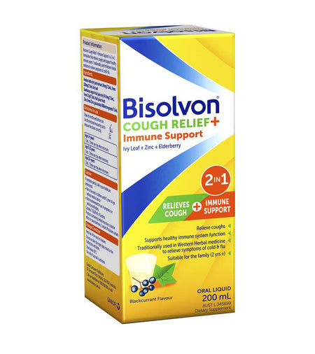 Bisolvon Cough Relief + Immune Support Liquid is a part of our 2-in-1 product range. It brings together a unique combination of ingredients for Australia of Ivy Leaf, Elderberry & Zinc and helps to provide cough relief while also supporting a healthy immune system function. Elderberry is traditionally used in Western herbal medicine to relieve symptoms of the common cold & flu.