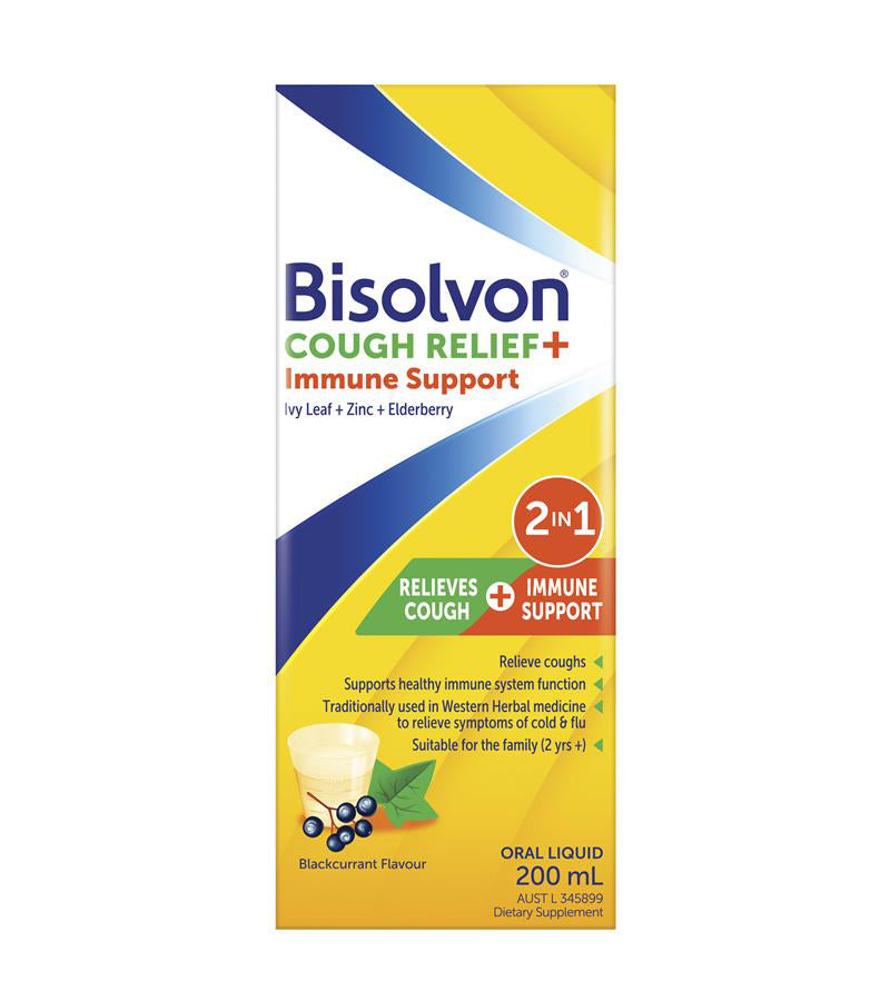 Bisolvon Cough Relief + Immune Support is a part of our 2-in-1 product range. It brings together a unique combination of ingredients for Australia of Ivy Leaf, Elderberry & Zinc and helps to provide cough relief while also supporting a healthy immune system function. Elderberry is traditionally used in Western herbal medicine to relieve symptoms of the common cold & flu.