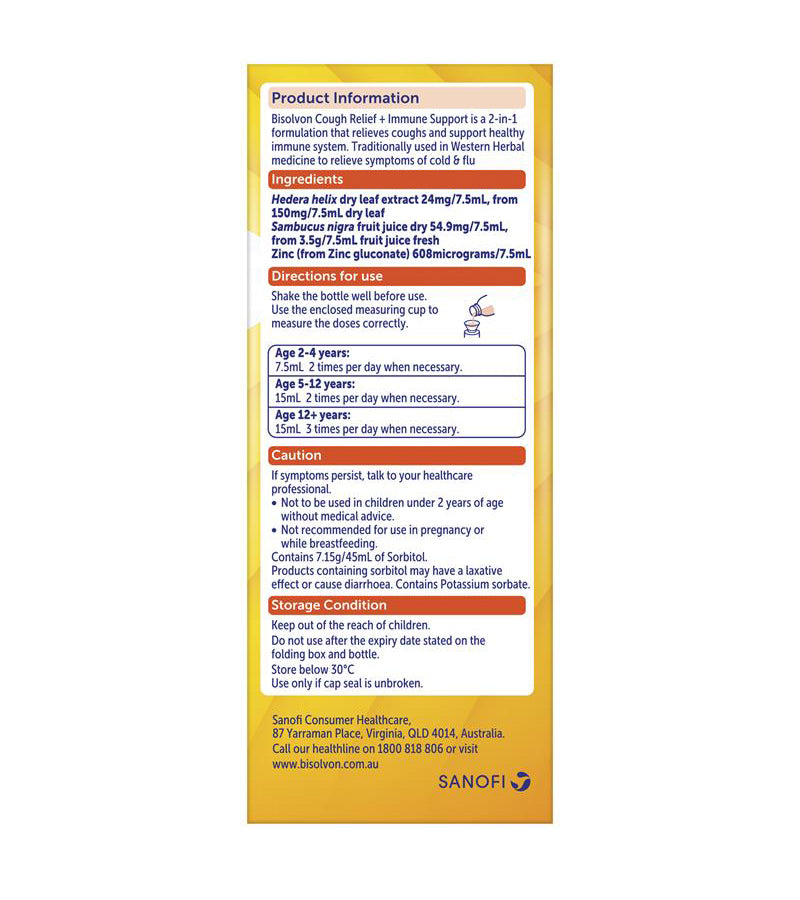 Bisolvon Cough Relief + Immune Support contains Hedera helix dry leaf extract 24mg/7.5mL from 150mg/7.5mL dry leaf, Sambucus nigra fruit juice dry 54.9mg/7.5mL from 3.5g/7.5mL fruit juice fresh and Zinc (from Zinc gluconate) 608micrograms/7.5mL.