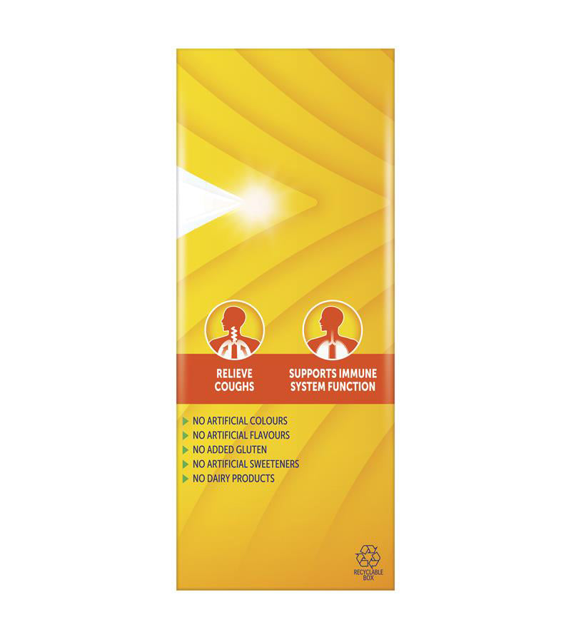 Bisolvon Cough Relief + Immune Support contains no artificial colours, artificial flavours, no added gluten, no artificial sweeteners, no dairy products.