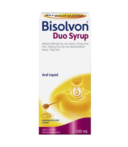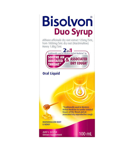 Bisolvon Duo Cough Syrup contains two naturally derived active ingredients – Marshmallow Root and Honey. Marshmallow Root has been traditionally used in Western Herbal Medicine to soothe an irritated throat and relieve an associated dry cough. It is suitable for adults and children aged over 2 years.