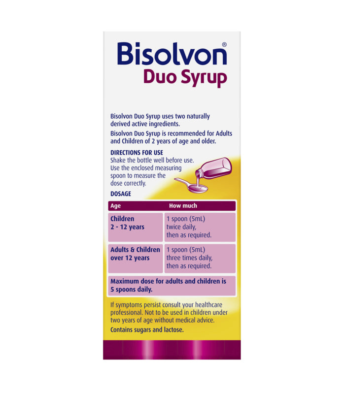 Bisolvon Duo Syrup provides relief of 2 symptoms in 1 convenient formula.