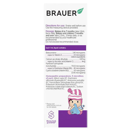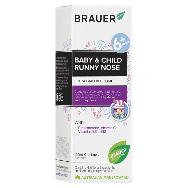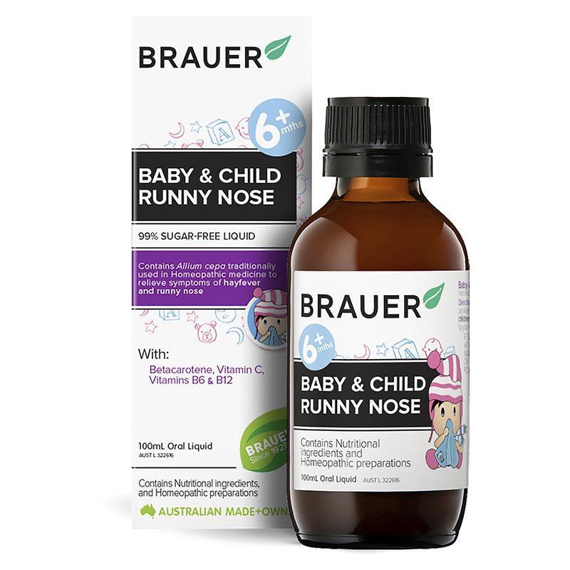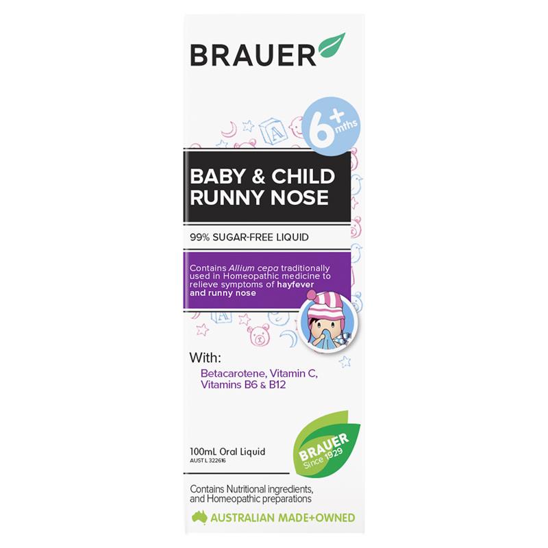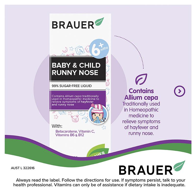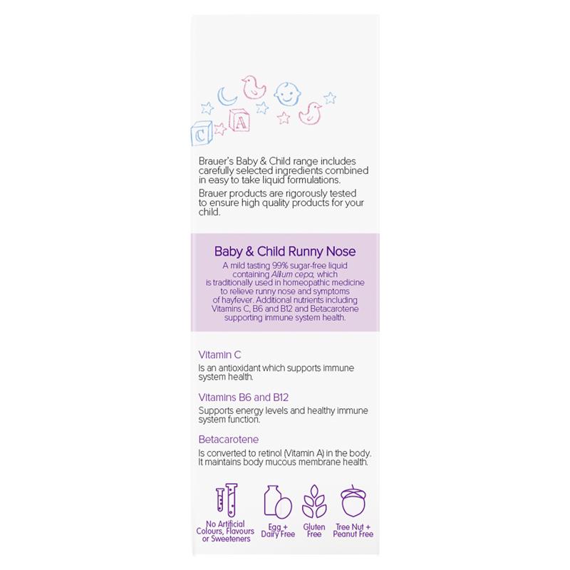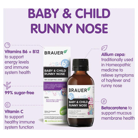 Brauer Baby & Child Runny Nose contains Allium cepa traditionally used in Homeopathic medicine to relieve symptoms of hayfever and runny nose. Mild-tasting, 99% sugar-free liquid.