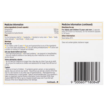 Phenylephrine may cause sleeplessness in some people. Keep to recommended dose. If an overdose is taken or suspected, ring the Poisons Information Centre (Australia 131126, New Zealand 0800 764 766) or go to a hospital straight away even if you feel well because of the risk of delayed serious liver damage.