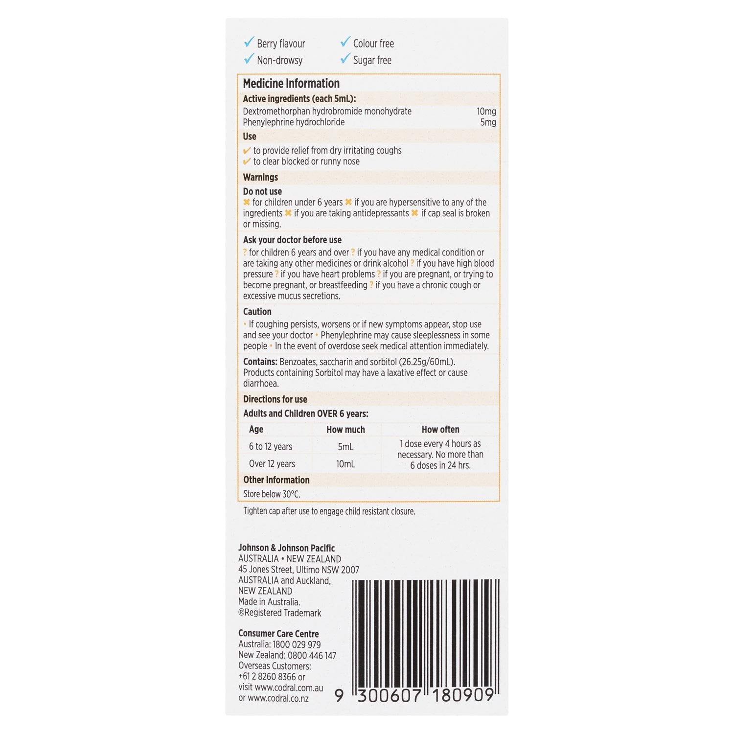 Do not use - for children under 6 years - if you are hypersensitive to any of the ingredients - if you are taking antidepressants - if cap seal is broken or missing. Ask your doctor before use - for children 6 years and over - if you have any medical condition or are taking any other medicines or drink alcohol- if you have high blood pressure - if you have heart problems - if you are pregnant, or trying to become pregnant, or breastfeeding - if you have a chronic cough or excessive mucus secretions. Contains: Benzoates, saccharin and sorbitol (26.25g/60mL). Products containing Sorbitol may have a laxative effect or cause diarrhoea.