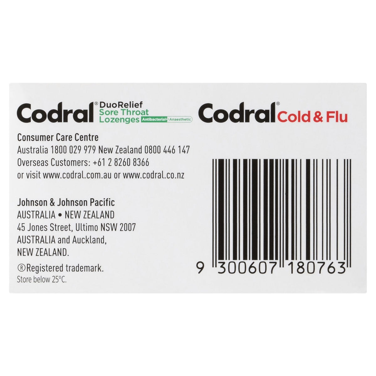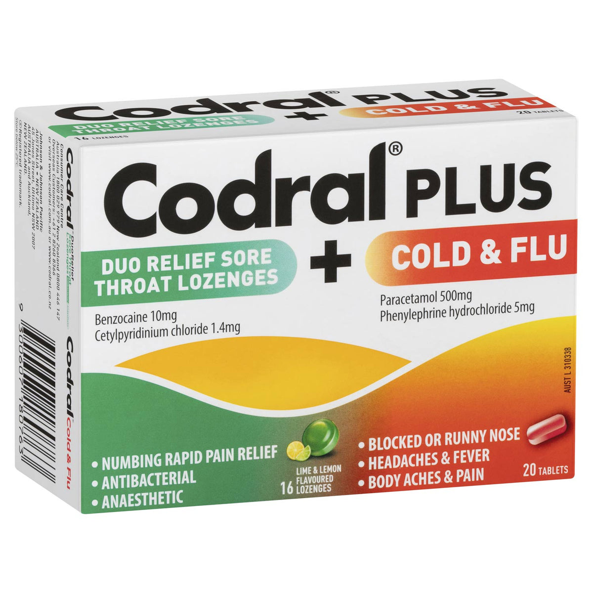 Codral Plus Duo Relief Sore Throat Lozenges Lime & Lemon Flavour 16 Pack + Codral Cold & Flu Tablets, value pack containing 16 lime & lemon sore throat lozenges and 20 cold & flu tablets.