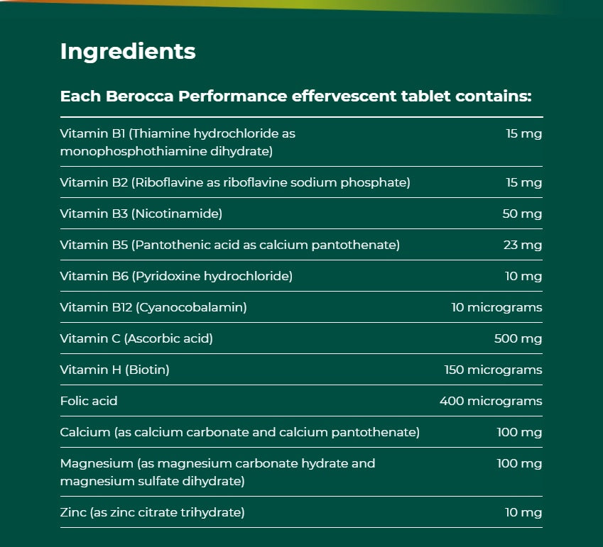 The formula of magnesium, zinc, calcium, vitamin C and all eight B vitamins helps release energy from your food, reduces tiredness and supports physical and mental stamina. This makes Berocca Performance a good choice for getting through those late nights and challenging days.