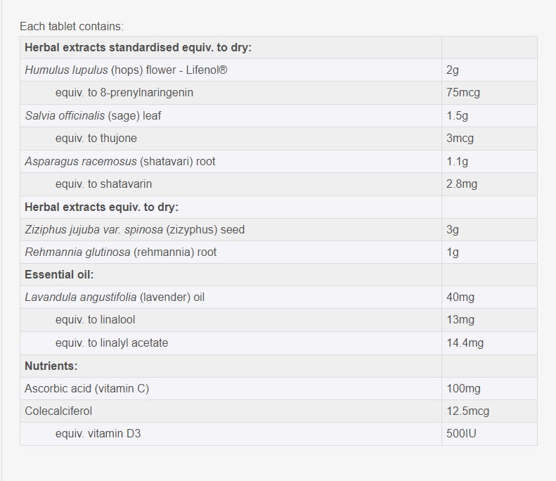 Ingredients: Each tablet contains: Herbal extracts standardised equiv. to dry: Humulus lupulus (hops) flower - Lifenol® 2g, equiv. to 8-prenylnaringenin 75mcg, Salvia officinalis (sage) leaf 1.5g, equiv. to thujone 3mcg, Asparagus racemosus (shatavari) root 1.1g, equiv. to shatavarin 2.8mg, Herbal extracts equiv. to dry: Ziziphus jujuba var. spinosa (zizyphus) seed 3g, Rehmannia glutinosa (rehmannia) root 1g, Essential oil: Lavandula angustifolia (lavender) oil 40mg, equiv. to linalool 13mg, equiv. to linalyl acetate 14.4mg