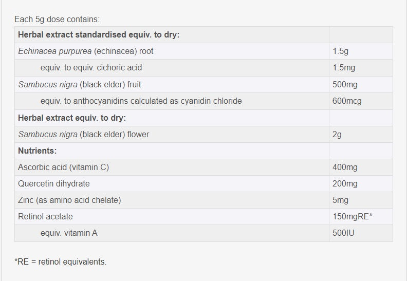 Ingredients: Each 5g dose contains: Herbal extract standardised equiv. to dry: Echinacea purpurea (echinacea) root 1.5g, equiv. to equiv. cichoric acid 1.5mg, Sambucus nigra (black elder) fruit 500mg, equiv. to anthocyanidins calculated as cyanidin chloride 600mcg, Herbal extract equiv. to dry: Sambucus nigra (black elder) flower 2g