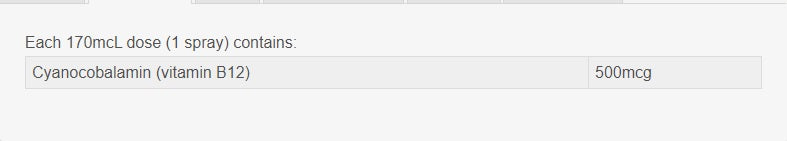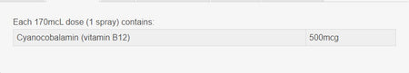 Ingredients: Each 170mcL dose (1 spray) contains: Cyanocobalamin (vitamin B12) 500mcg