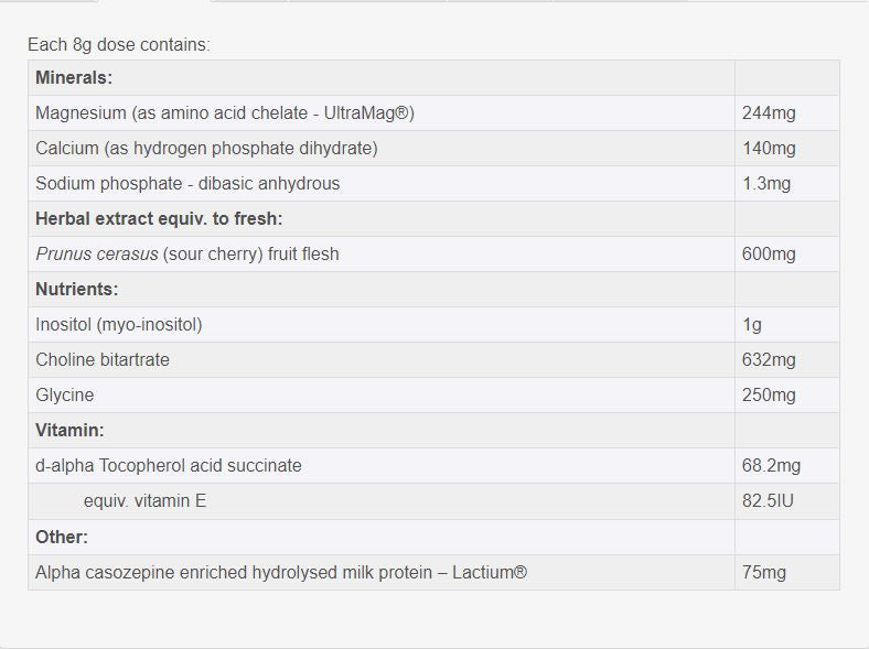 Ingredients: Each 8g dose contains: Minerals: Magnesium (as amino acid chelate - UltraMag®) 244mg, Calcium (as hydrogen phosphate dihydrate) 140mg, Sodium phosphate - dibasic anhydrous 1.3mg, Herbal extract equiv. to fresh: Prunus cerasus (sour cherry) fruit flesh 600mg, Nutrients: Inositol (myo-inositol) 1g, Choline bitartrate 632mg, Glycine 250mg, Vitamin: d-alpha Tocopherol acid succinate 68.2mg, equiv. vitamin E 82.5IU, Other: Alpha casozepine enriched hydrolysed milk protein – Lactium® 75mg