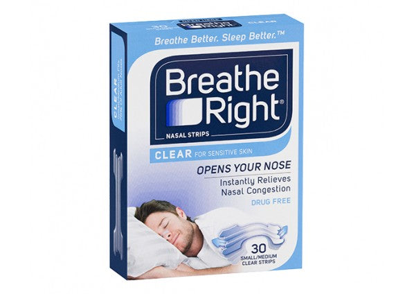 Breathe Right Nasal Strips Clear for Sensitive Skin Small-Medium reduce or eliminate snoring and provide instant relief from nasal congestion due to colds, allergies and sinusitis. It gently open nasal passages so you can breathe through your nose and close your mouth, reducing snoring. Each drug-free, non-prescription nasal strip consists of flexible, "spring-like" bands. Placed correctly across the nose, the bands gently lift the sides of nose and provides snoring relief. Clear nasal strips are especially for people with delicate skin.