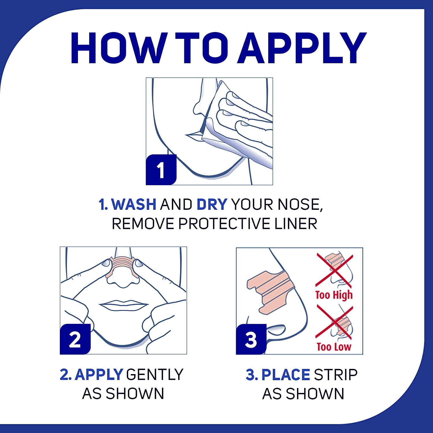 Apply to Nose - Gently rub the strip to secure it onto your nose. Nasal strips come in different sizes to fit different nose types, so you should determine which size is best for you. Also, it's important to always refer to the packaging leaflet before use.