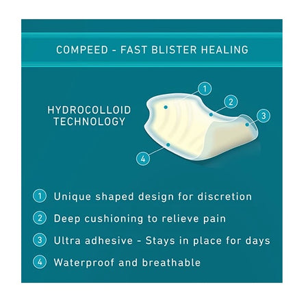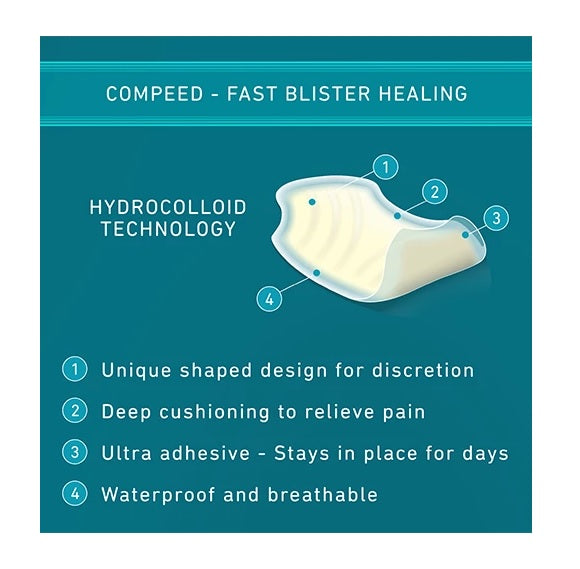 COMPEED® hydrocolloid technology is an active gel with moisture absorbing particles. Thick cushioning redistributes pressure from the blister to deliver instant pain relief.