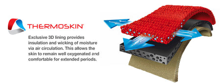 Exclusive 3-dimensional lining that provides insulation and wicking of moisture via air circulation. This allows the skin to remain well oxygenated and comfortable for extended periods.