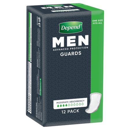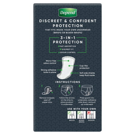 Depend Guards for Men, designed to fit the male anatomy, it provides cup-shaped protection right where men need it most. Soft side shields keep fluid inside, away from clothing, to prevent leakage. Pocket-sized, maximum protection for larger bladder leaks, worn inside your own underwear.