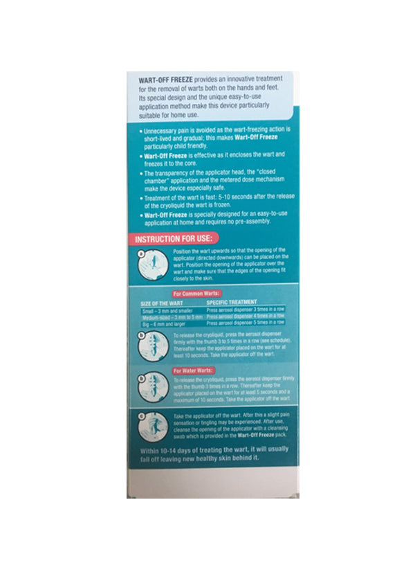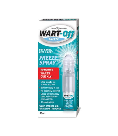 Wart Off Freeze, a cryotherapy spray treatment for warts in a 38mL bottle. For the treatment of common (Verruca vulgaris) and plantar warts.