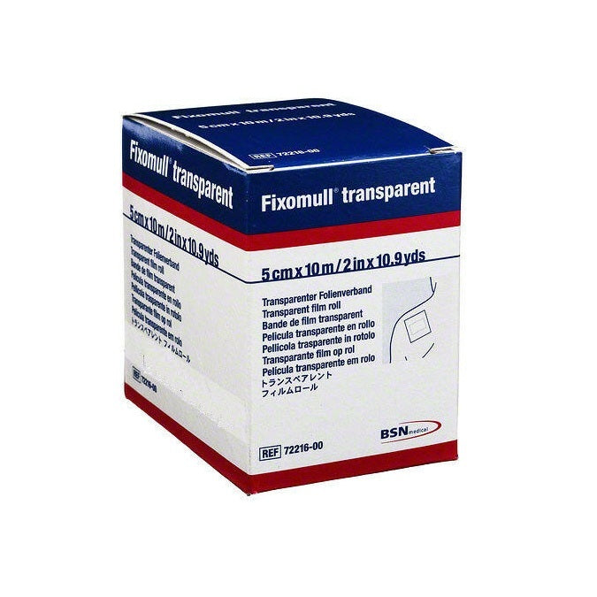 Fixomull transparent is a transparent and waterproof polyurethane film coated with a very skin-friendly polyacrylate adhesive. The waterproof film offers optimal protection for the wound. It is waterproof and a bacterial barrier. Its semipermeable structure allows the skin to breathe thus reducing the risk of macerations. The extra-thin film conforms like a second skin to the contours of the body, including joints and extremities. The transparency of the film keeps the dressing inconspicuous and allows visual inspection of the wound environment at all times. Fixomull transparent is easy to apply due to its innovative application system.