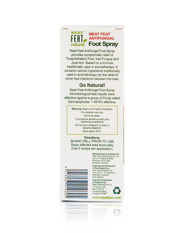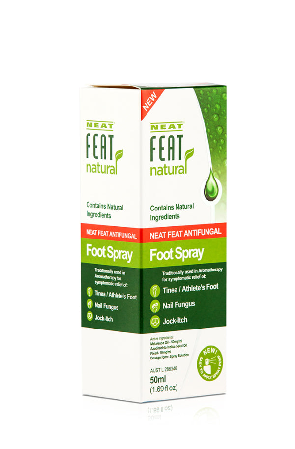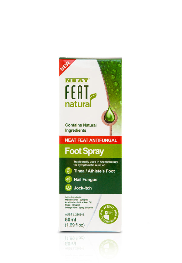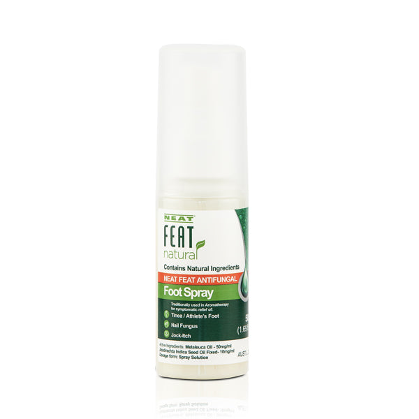 Neat Feat Natural Antifungal Foot Spray provides symptomatic relief of Tinea/Athlete’s Foot, Nail Fungus and Jock-Itch. Based on a formula traditionally used in aromatherapy. It contains natural ingredients traditionally used in aromatherapy for the relief of minor foot infections between the toes.