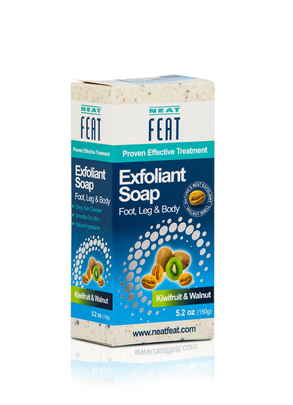 During showering use the Neat Feat Foot Scrub Soap, an exfoliating soap that removes ingrained dirt and dead skin.