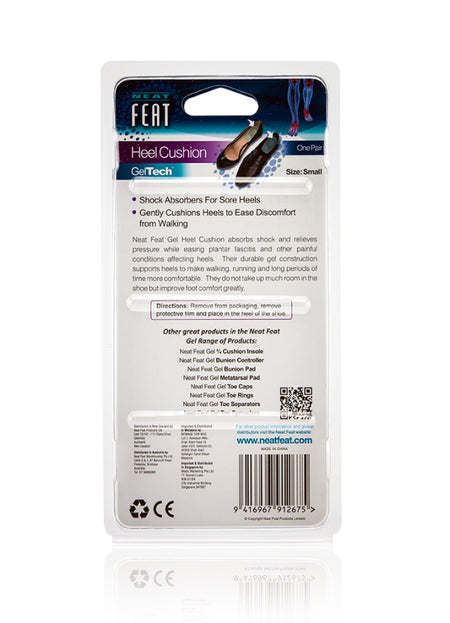 - Neat Feat Gel Heel Cushion absorbs shock and relieves pressure while easing plantar fascitis and other painful conditions affecting heels.
