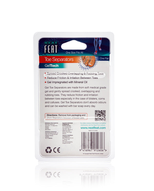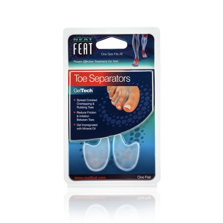 Neat Feat Gel Toe Separators are narrow gel inserts designed to fit in between the smaller toes. Gel Toe Separators are made from soft medical grade gel and gently spread crooked, overlapping and rubbing toes. They prevent ongoing rubbing and corns between the little toes.