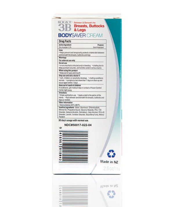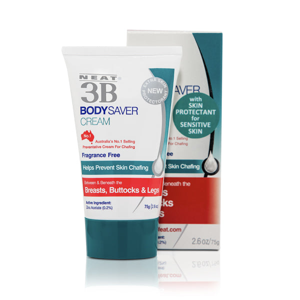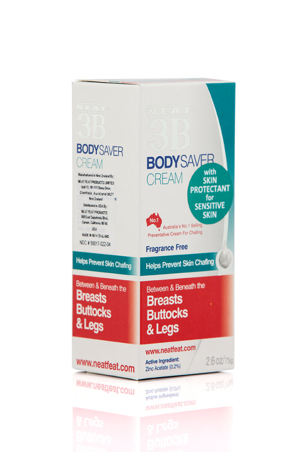Neat 3B Body Saver Cream incorporates an effective antiperspirant in an emollient, soothing cream base for application to areas where skin surfaces rub together and become inflamed. The underlying problem in these situations is perspiration and the resultant chafing between skin surfaces: sites at which this occurs are between the buttocks, between the legs and beneath the breasts (hence 3B).