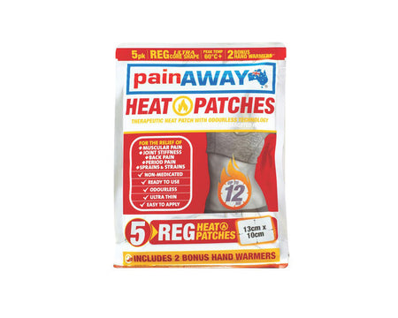 Pain Away Heat Patches Regular are air activated, open only when ready to use. Pain away heat patches provide targeted, sustained, long lasting & soothing pain relief of back pain, muscular aches and pains, effective relief from period pain, joint stiffness, sprains and strains. Heat therapy increases blood flow to the affected area providing oxygen and nutrients to aid the muscle healing process.
