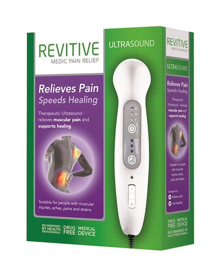 Revitive Ultrasound Therapy is a handheld ultrasound device that emits high frequency sound vibrations to help relieve pain. Ultrasound is a drug-free medical device, commonly used by physiotherapists and is designed to be used in the home.
