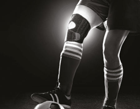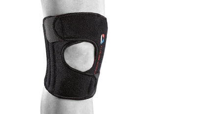 Step 1: Checking the access points to the side stabilisers are at the top of the support position the middle of the Sport Knee Stabiliser behind your knee and then wrap the bottom straps towards each other and secure underneath your patella.