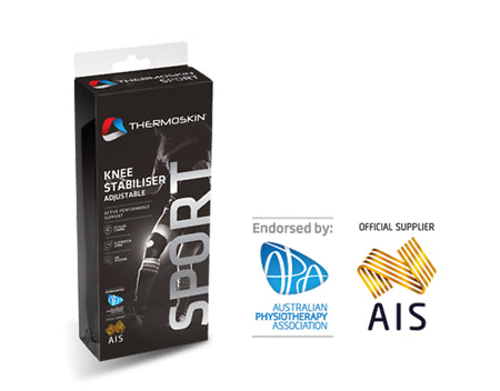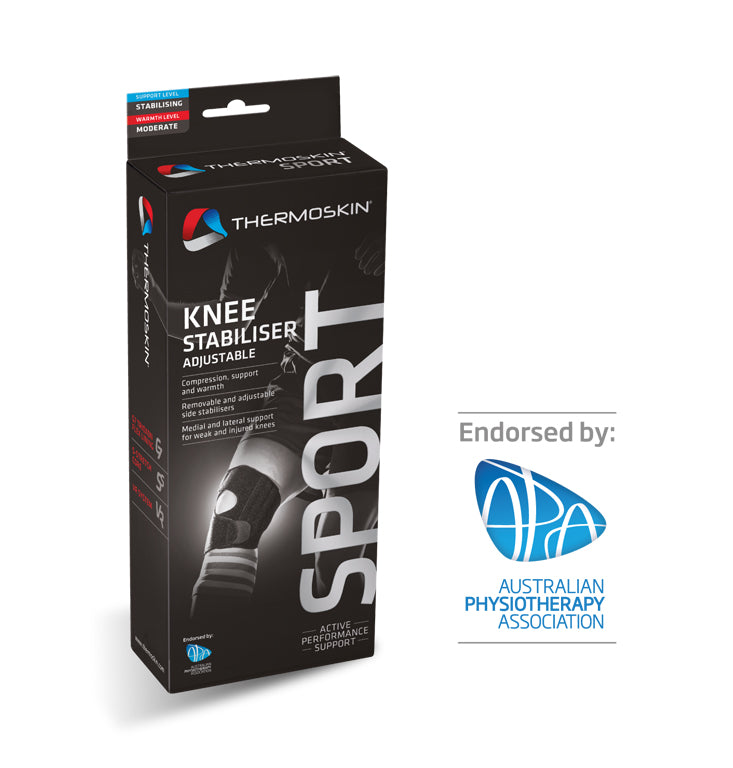 Thermoskin Sport Knee Stabilizer Adjustable, provides compression, medial and lateral support and warmth for the knee during periods of increased activity. Flexibility to position side stabilizers dependent on how support wraps to ensure support is given to the correct area.