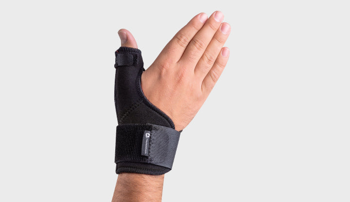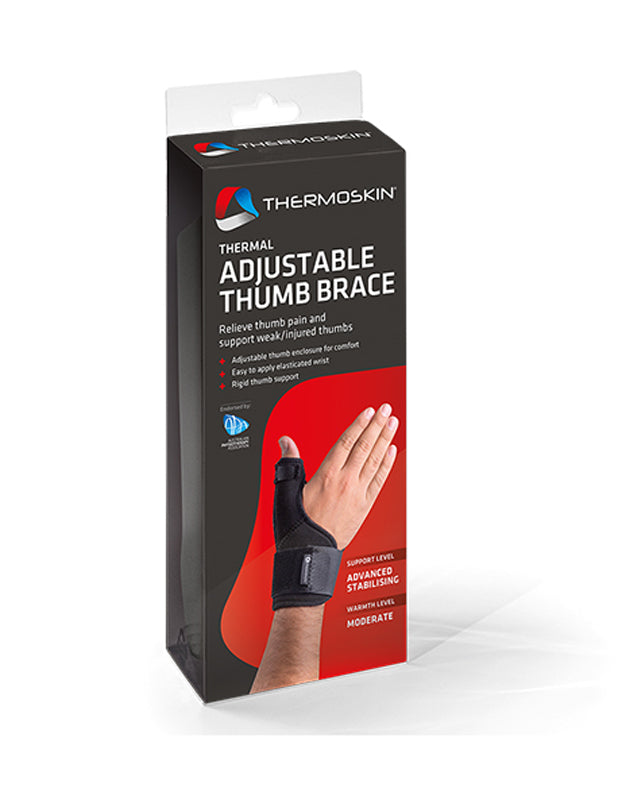 Thermoskin Adjustable Thumb Brace has a rigid splint that supports the CMC joint and reduces the affects of thumb hyperextension to relieve thumb pain. Useful for UCL injuries associated with ball sports, skiing and work related repetitive strain problems.