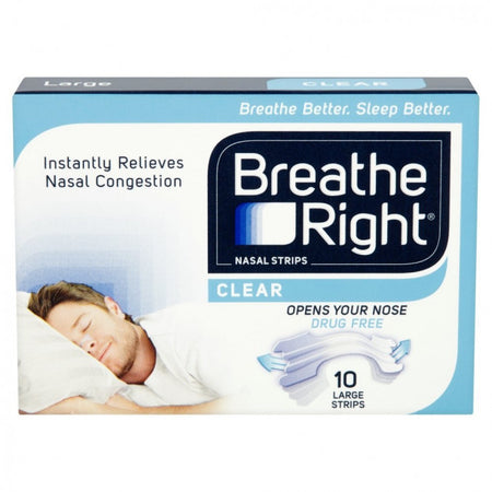 Breathe Right Large Clear Nasal Strip reduce or eliminate snoring and provide instant relief from nasal congestion due to colds, allergies and sinusitis. It gently open nasal passages so you can breathe through your nose and close your mouth, reducing snoring. Each drug-free, non-prescription nasal strip consists of flexible, "spring-like" bands. Placed correctly across the nose, the bands gently lift the sides of nose and provides snoring relief. Clear nasal strips are especially for people with delicate skin.