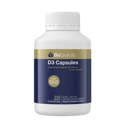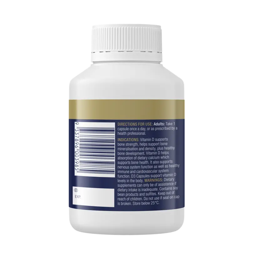 D3 Capsules contains 1000 IU of vitamin D3. Vitamin D supports healthy bone development plus helps maintain bone mineralisation and density. Vitamin D supports the absorption of dietary calcium. It also supports nervous system health as well as healthy immune system and cardiovascular function. D3 Capsules support vitamin D levels in the body.