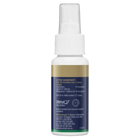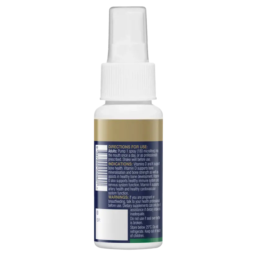 Vitamin D3 and K2 are important for supporting bone health. Vitamin D3 helps maintain bone mineralisation and bone strength as well as assists in healthy bone development. Vitamin D3 also supports a healthy immune system and nervous system function. Vitamin K2 supports artery health and maintains healthy cardiovascular system function. Each 50mL bottle contains 277 sprays.