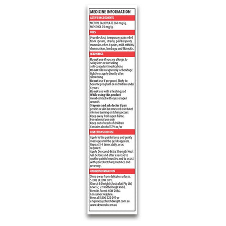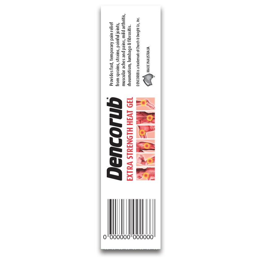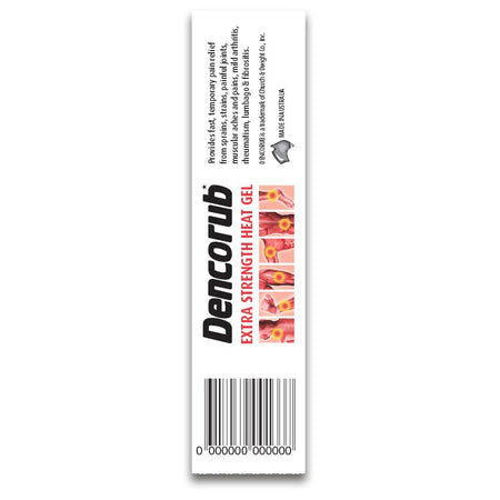 Dencorub Extra Strength Heat Gel provides temporary pain relief from sprains, strains, painful joints, muscular aches and pains, and for mild pain of medically diagnosed arthritis, lumbago and fibrositis.