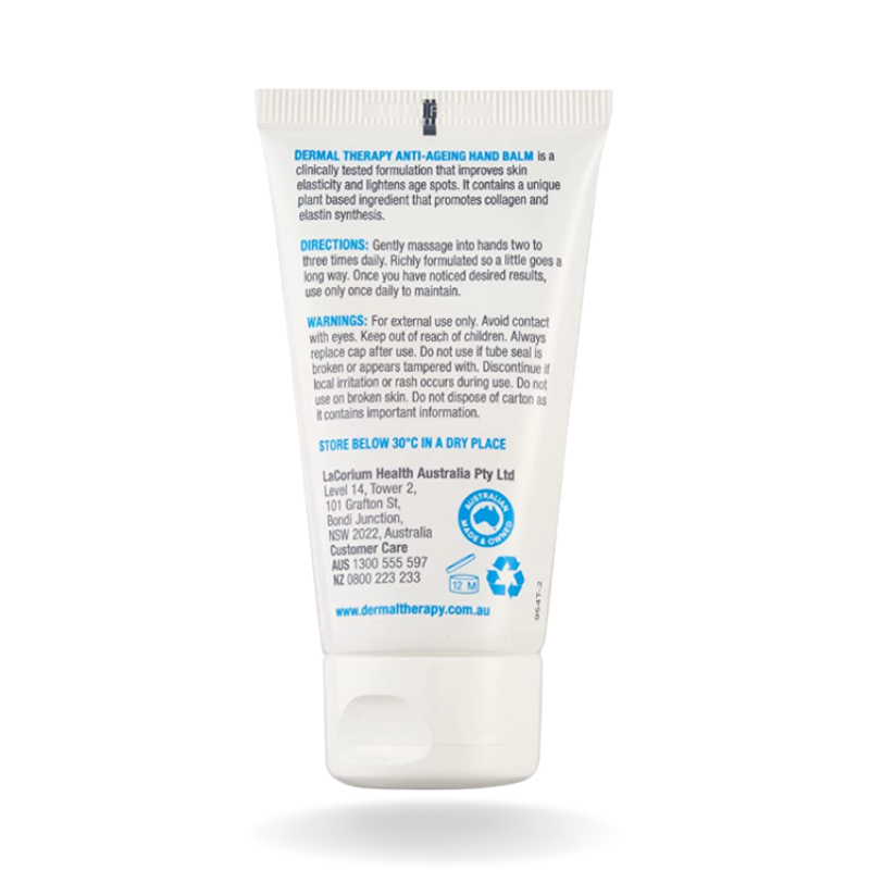 - Dermal Therapy Anti-Ageing Hand Balm is designed to repair loss of firmness.