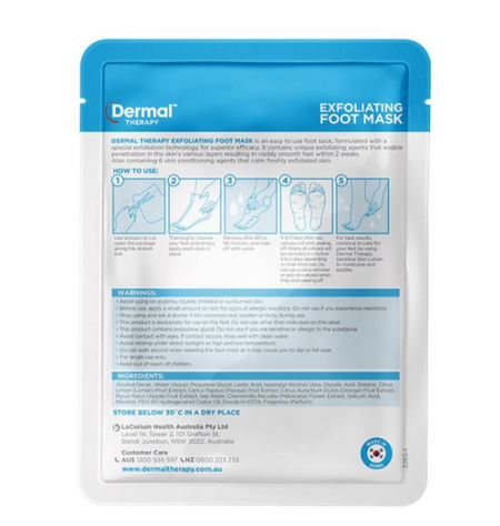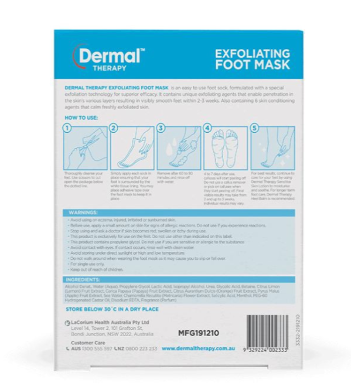 Dermal Therapy Exfoliating Foot Mask, Peel back the layers of dry hardened skin and discover feet so soft and smooth they’ll feel as good as new. Try Australia’s only exfoliating foot mask using multi-layer penetration technology for ultimate exfoliation.