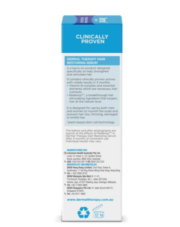 Dermal Therapy Hair Restoring Serum, specifically designed to help strengthen and stimulate hair. Formulated with 2 clinically tested active complexes to stop hair loss and stimulate hair. We’re proud to say that the efficacy has been confirmed by trial.